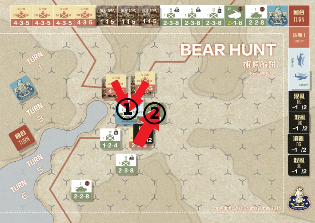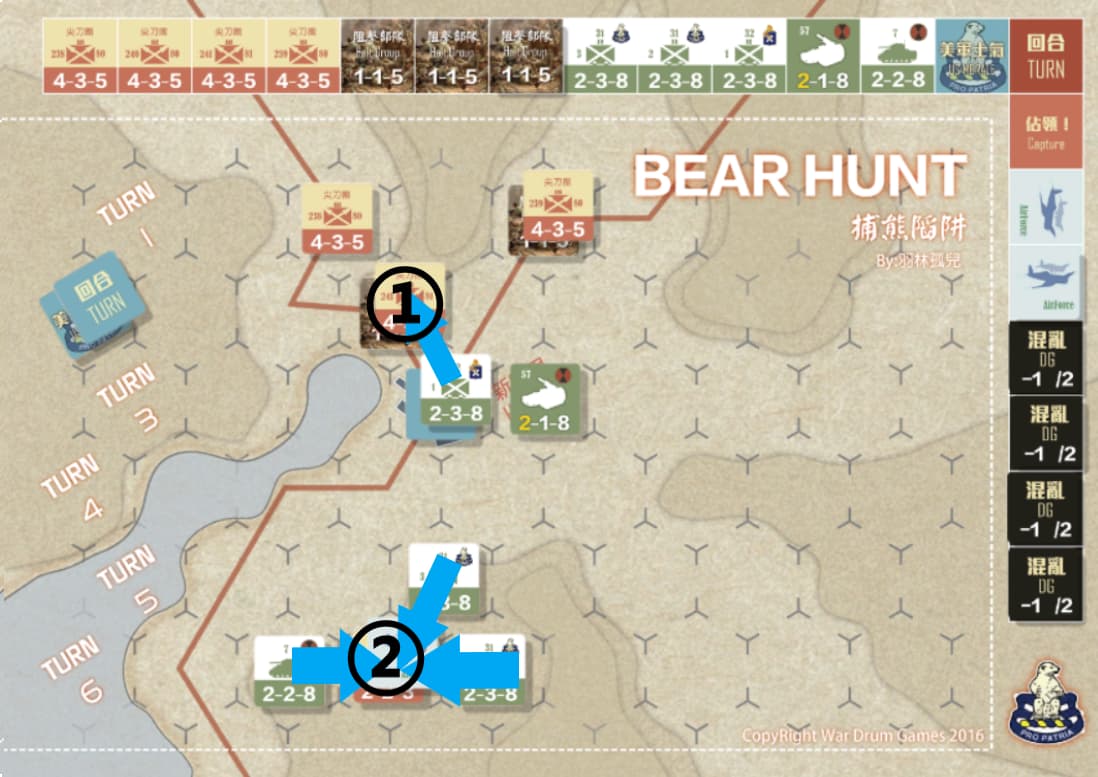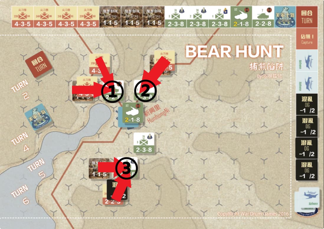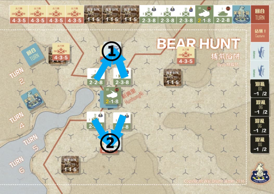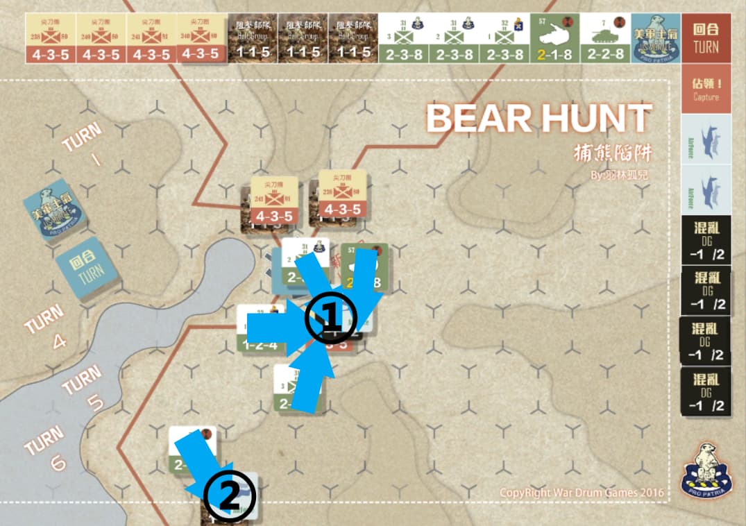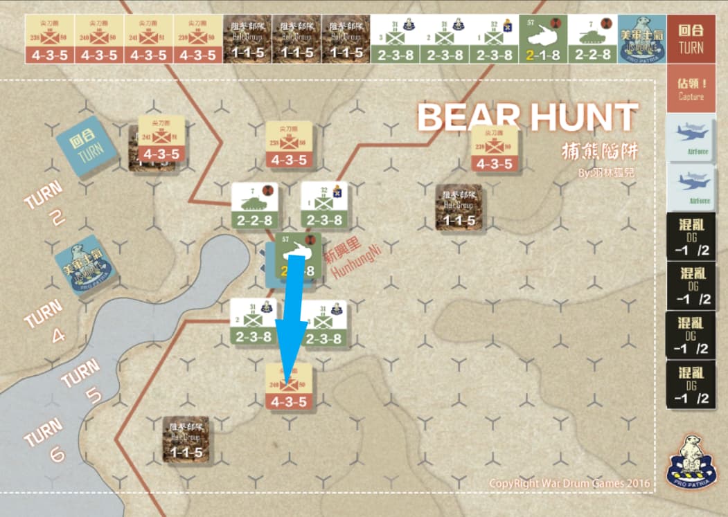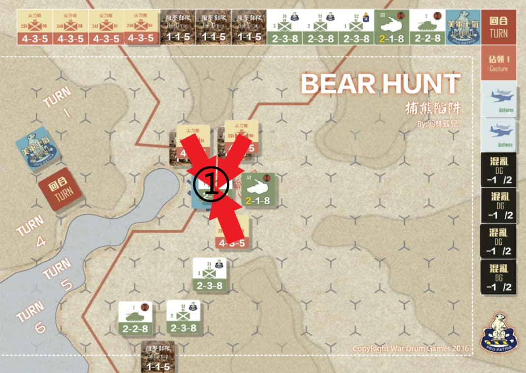 志愿军抓住了最后的一丝机会,卡住了美军撤离的ZOC。根据规则书,美军每个单位在脱离地图前都会遭到志愿军的阻击。
