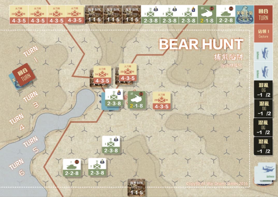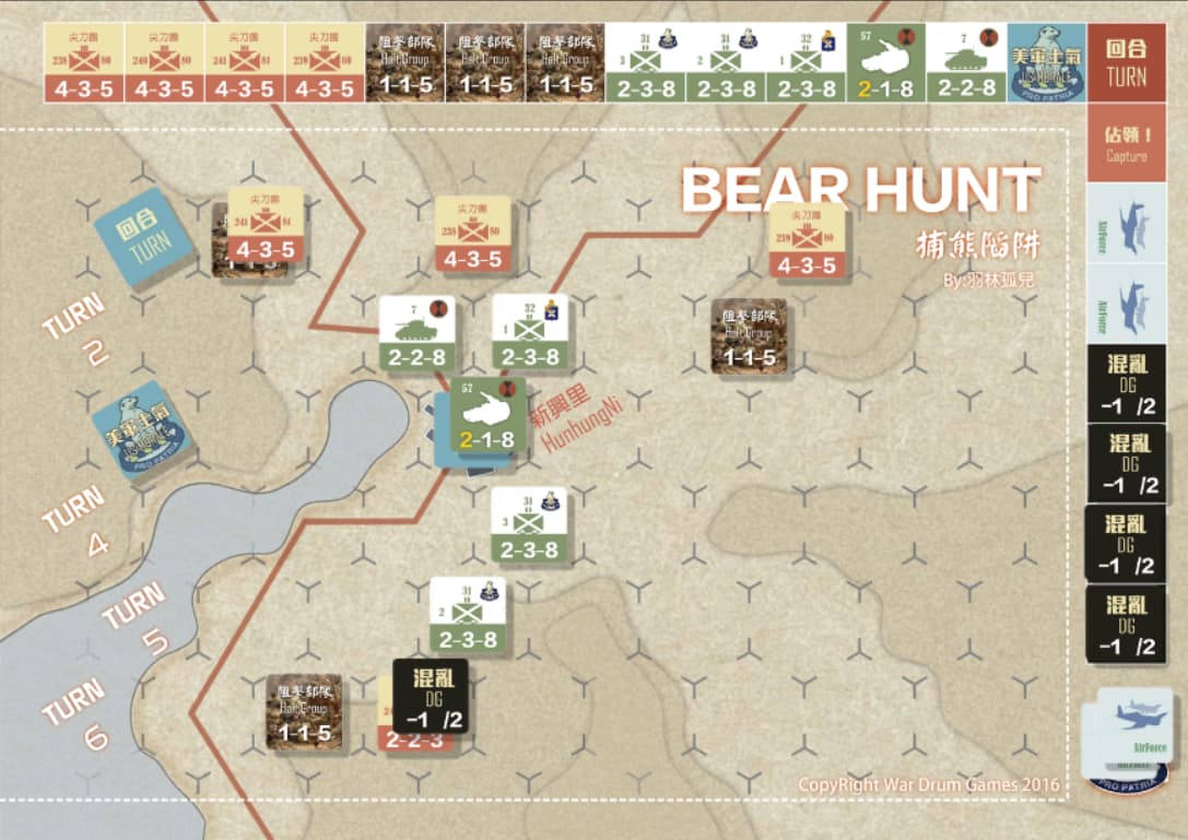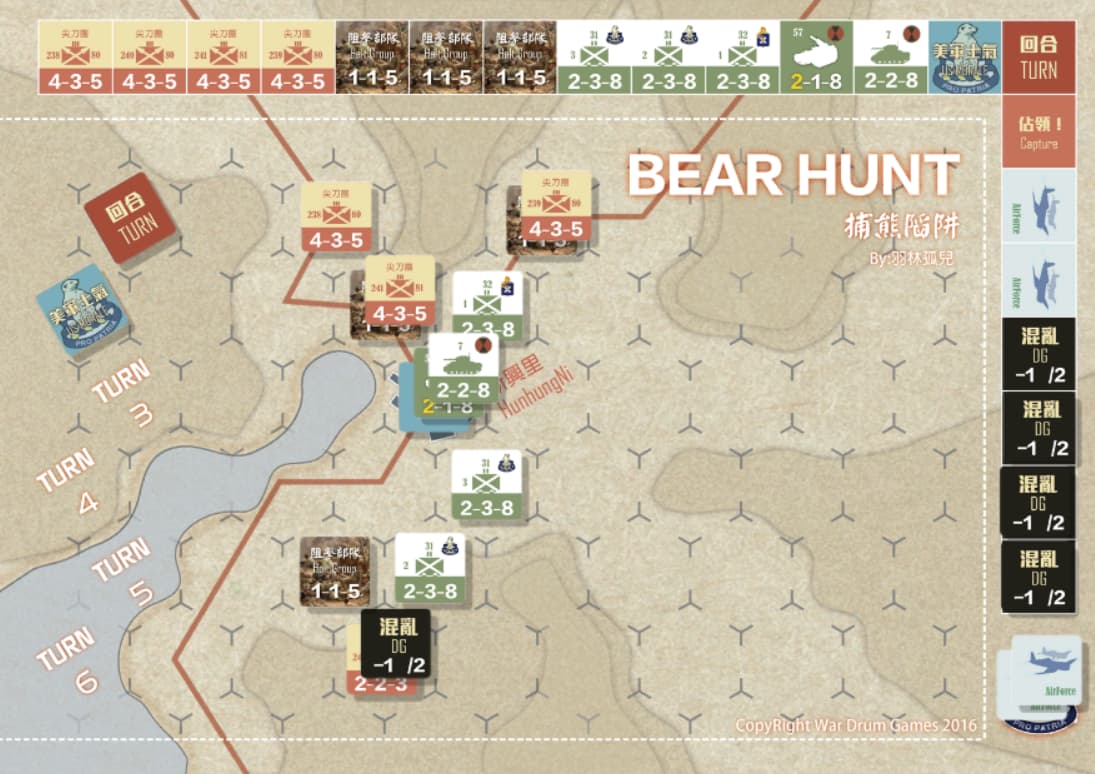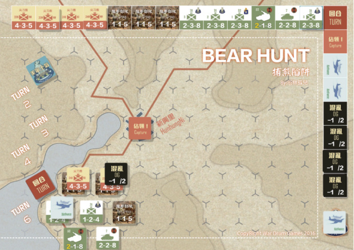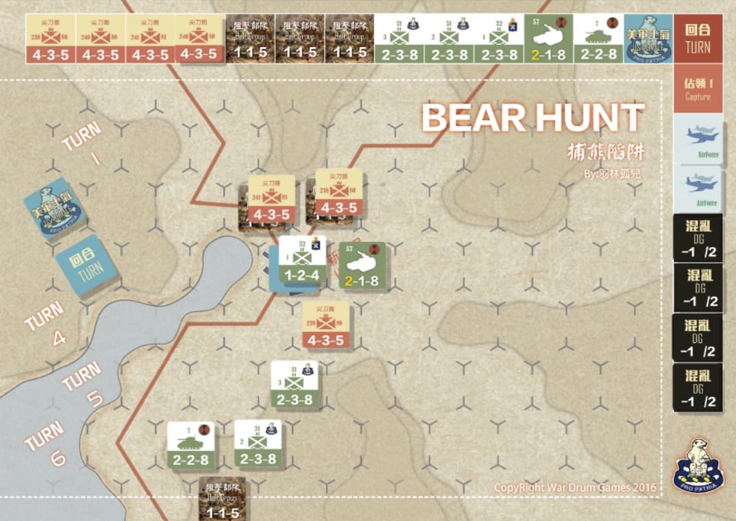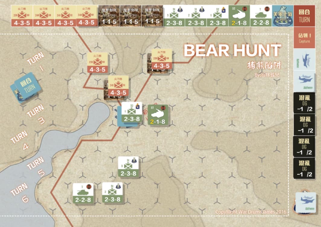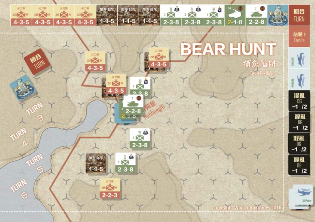 棋友们好!今天我们来玩一款以抗美援朝为背景的明信片兵棋:捕熊陷阱。作者羽林孤儿。