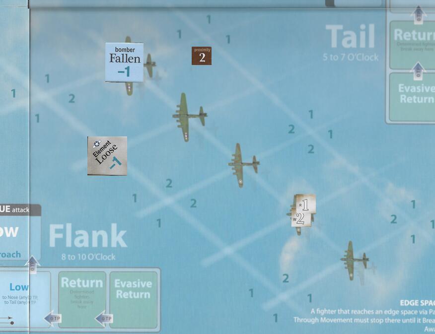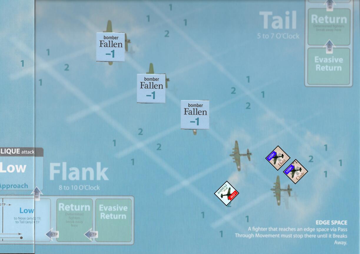 H于后中开始接近敌轰炸机。一队护航被部署到后中接近区,一队护航被部署到后低。H被击落。