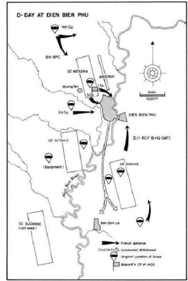 最初的空投在CSVN剧本DBP#1 Bruno Arrives有所体现。其中第6殖民地伞兵营在空降区“娜塔莎”(Natasha)着陆,这里位于旧日军机场以西,孟清(Muong Thanh)村以北。第2营在南边的空降区“西蒙尼”(Simone)着陆。随后重装备则在西南方的空降区“奥克塔维”(Octavie)着陆。