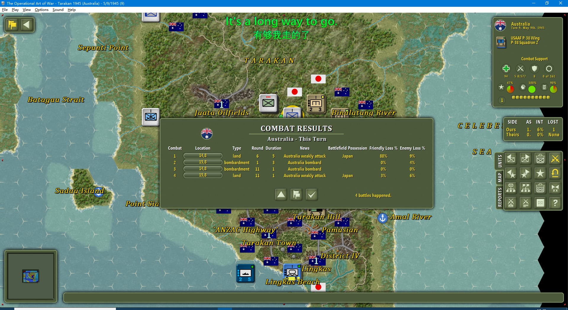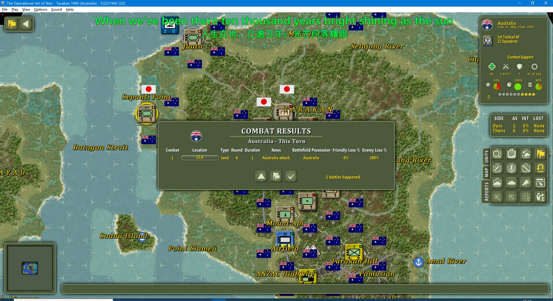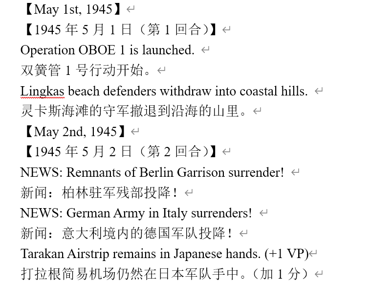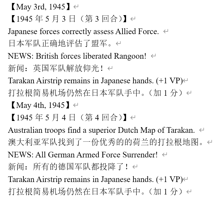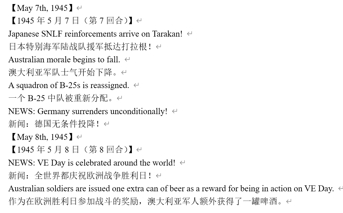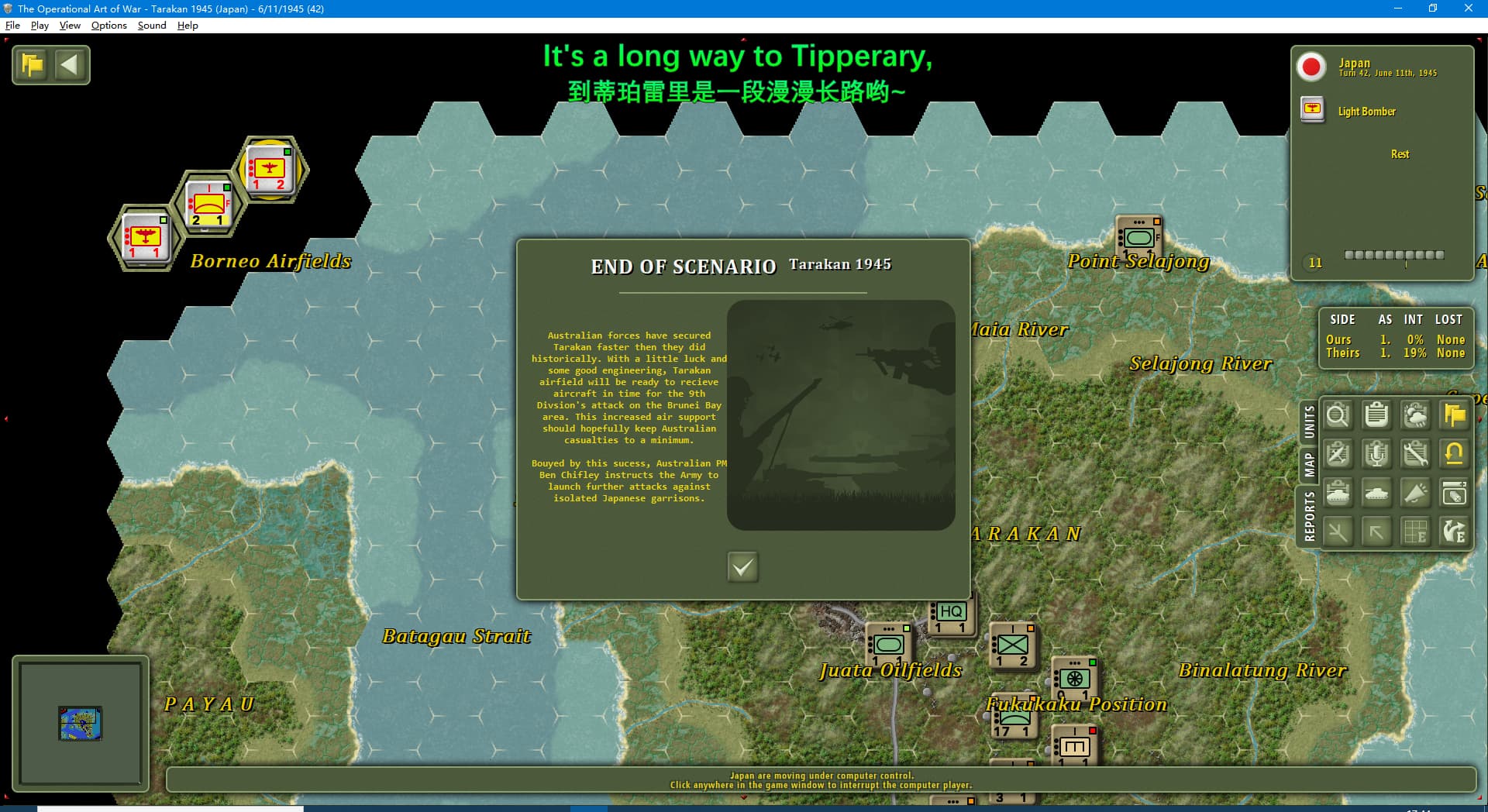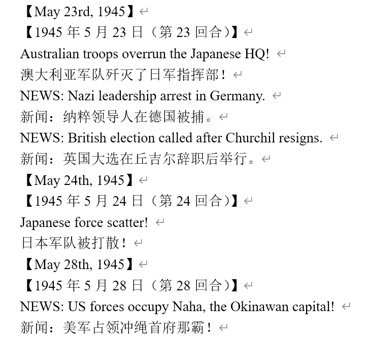 虽然新闻里连续报道我军士气下降(参见两个阶段的新闻事件链),但我军还是全歼了打拉根岛上的日军,占领了所有的胜利点,这次推演于1945年6月11日(第42回合)以我方获胜告终。