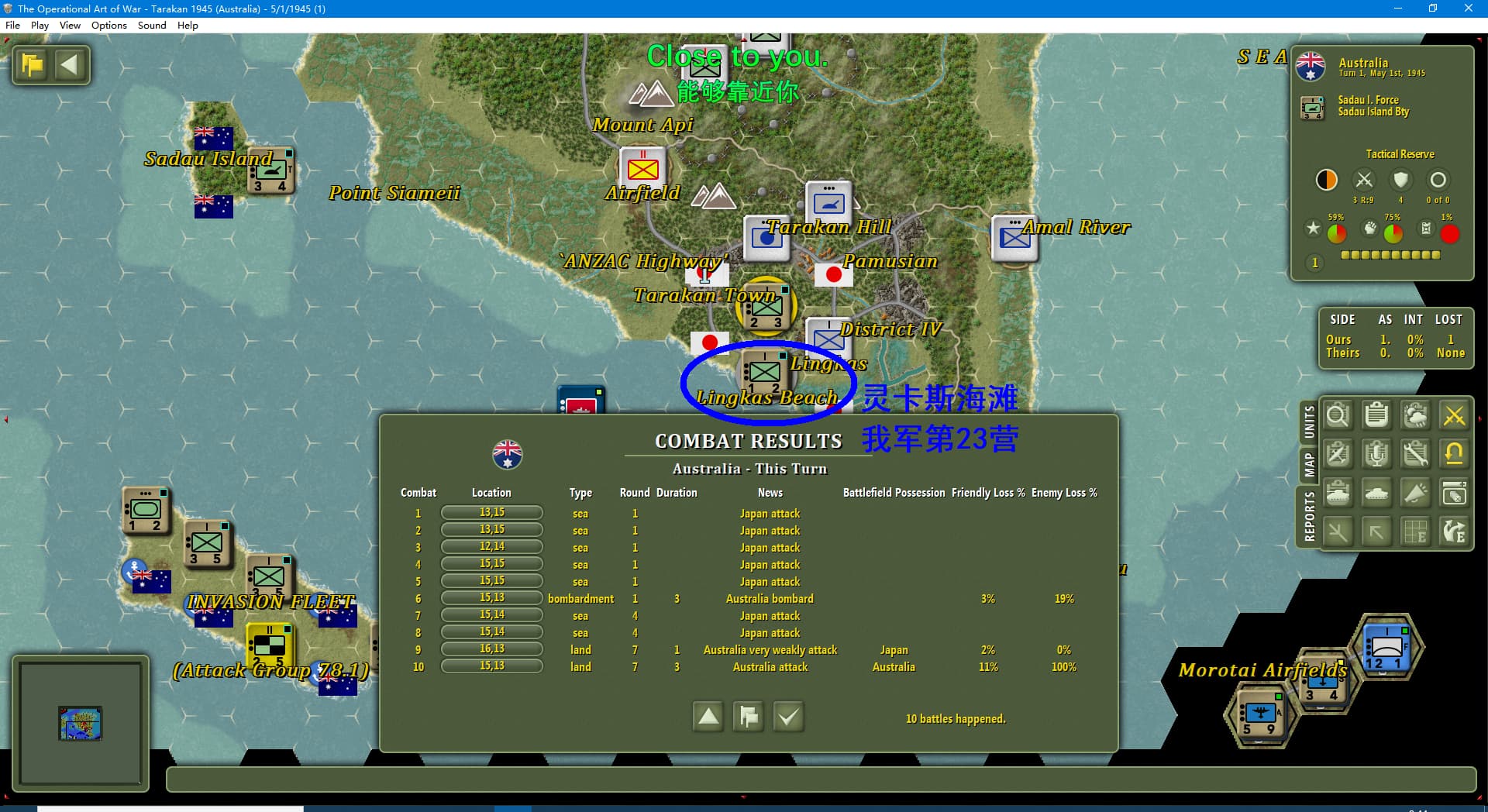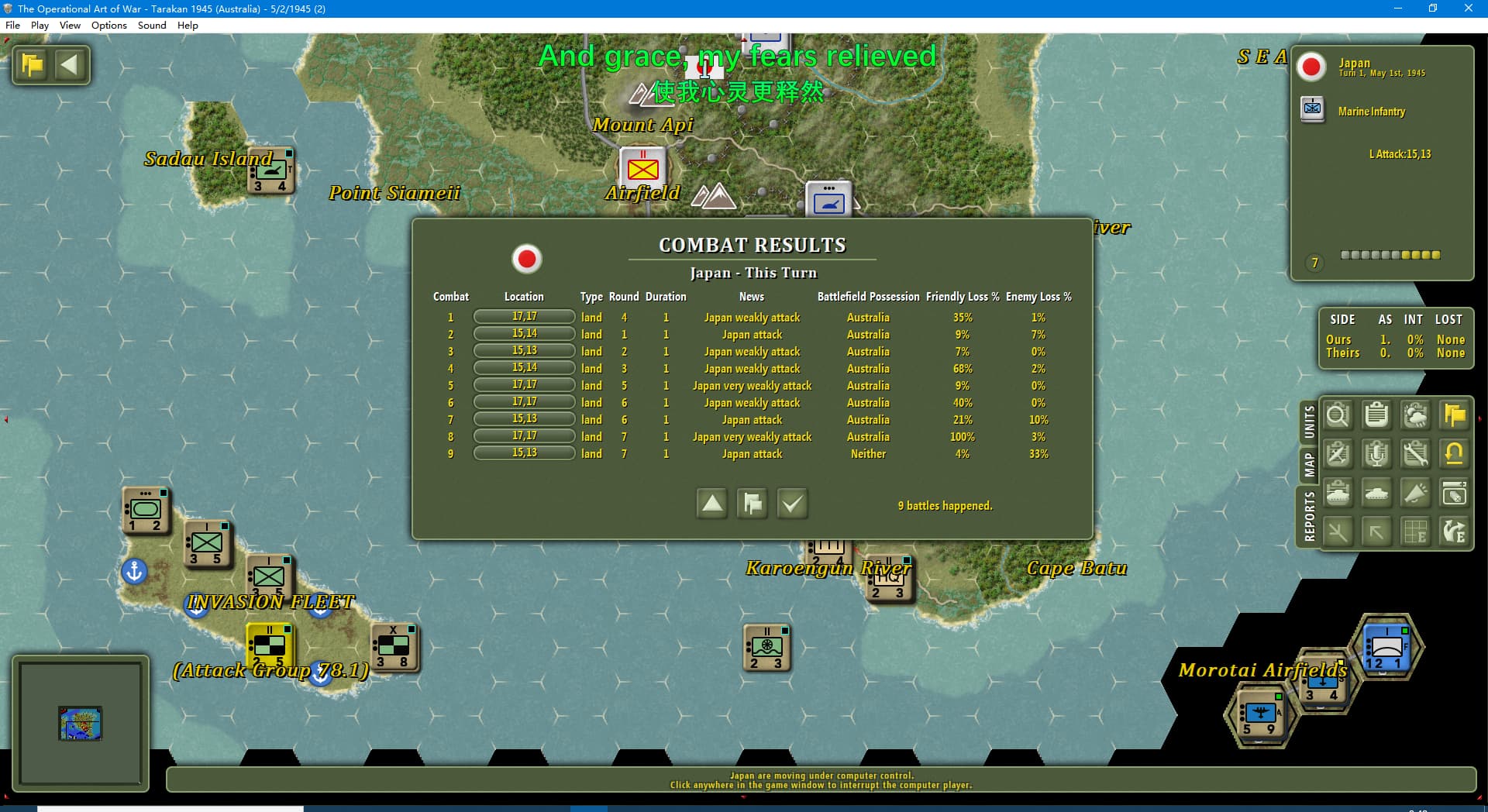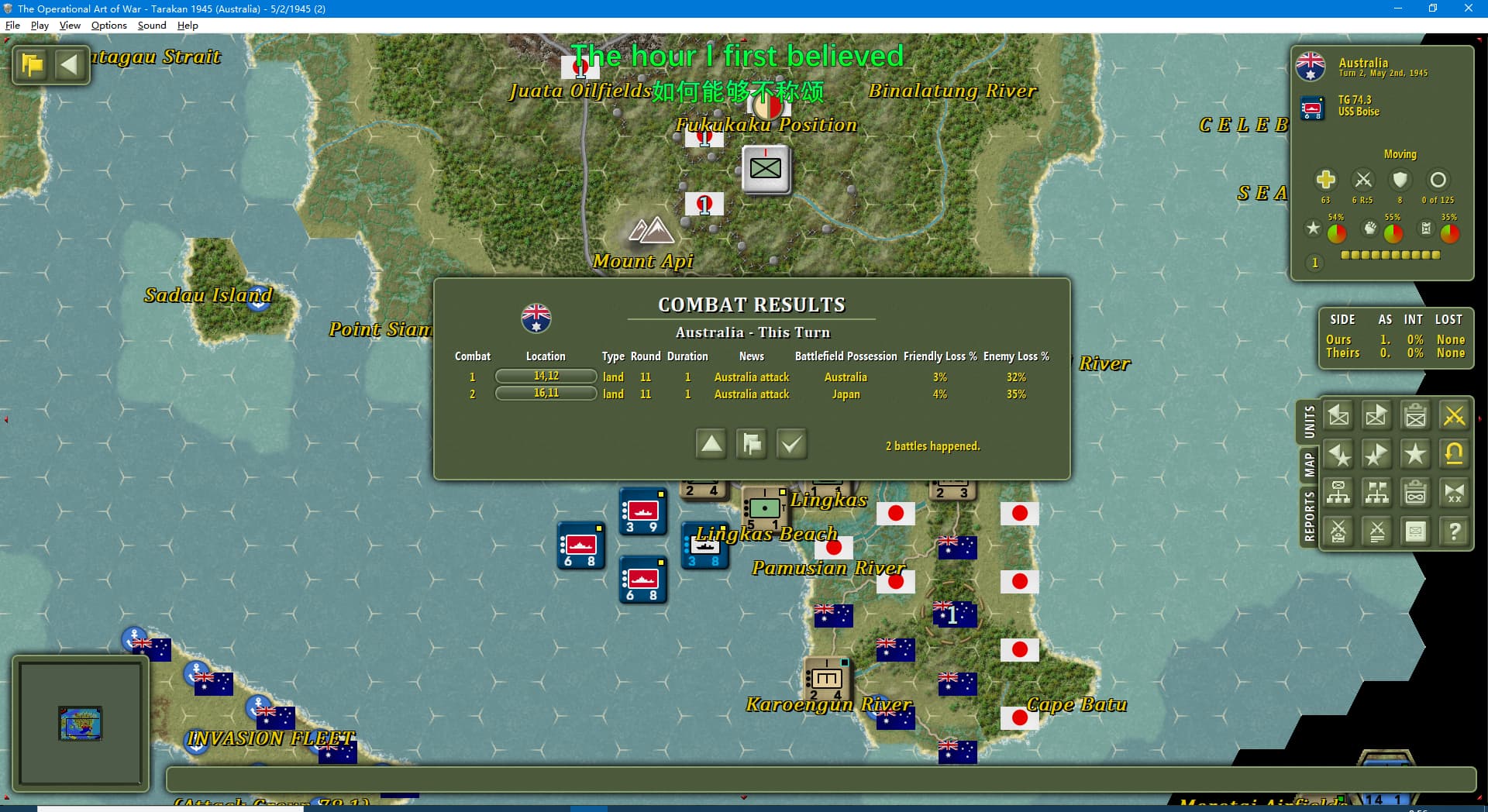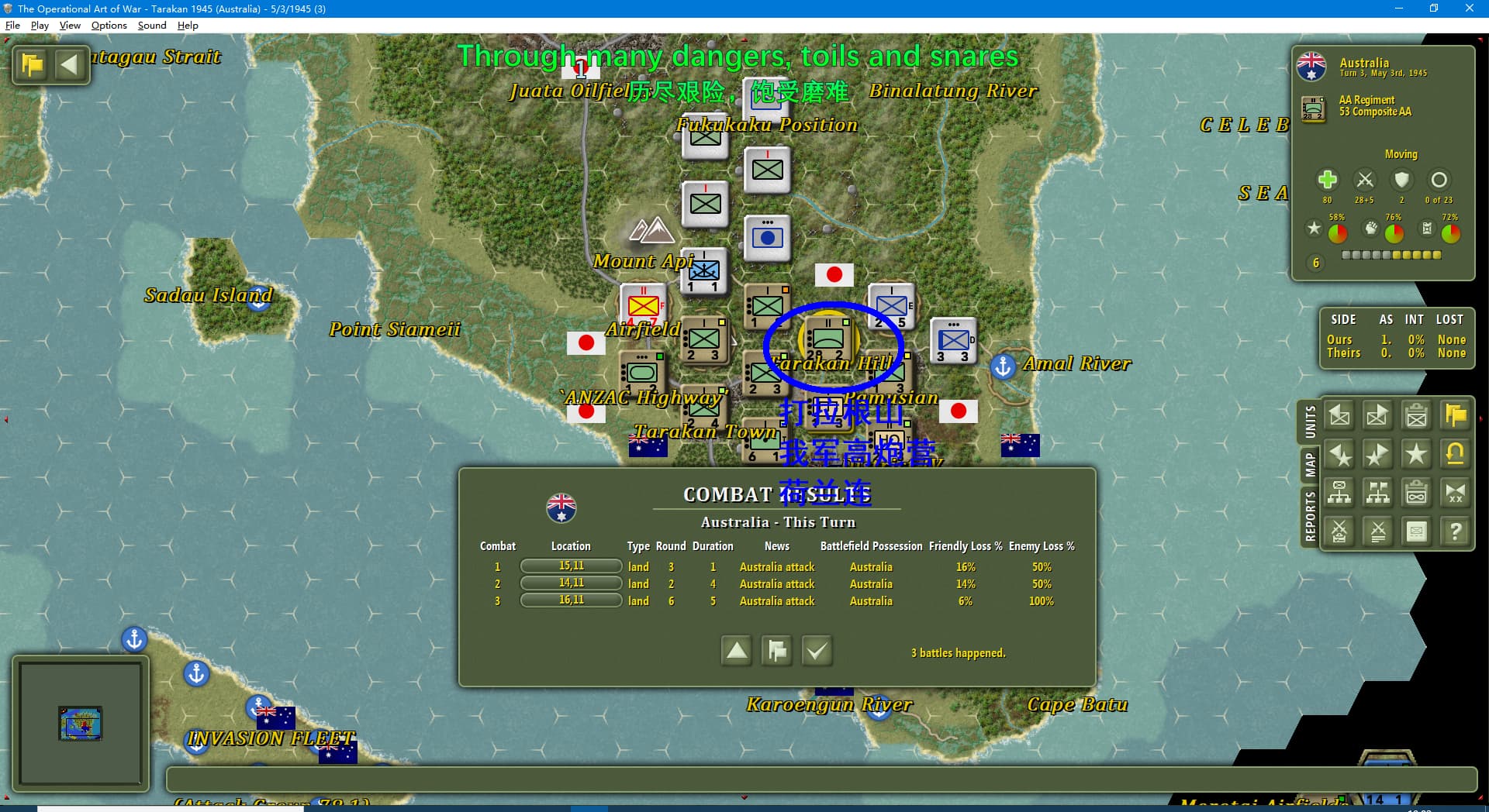 虽然新闻里连续报道我军士气下降(参见两个阶段的新闻事件链),但我军还是全歼了打拉根岛上的日军,占领了所有的胜利点,这次推演于1945年6月11日(第42回合)以我方获胜告终。