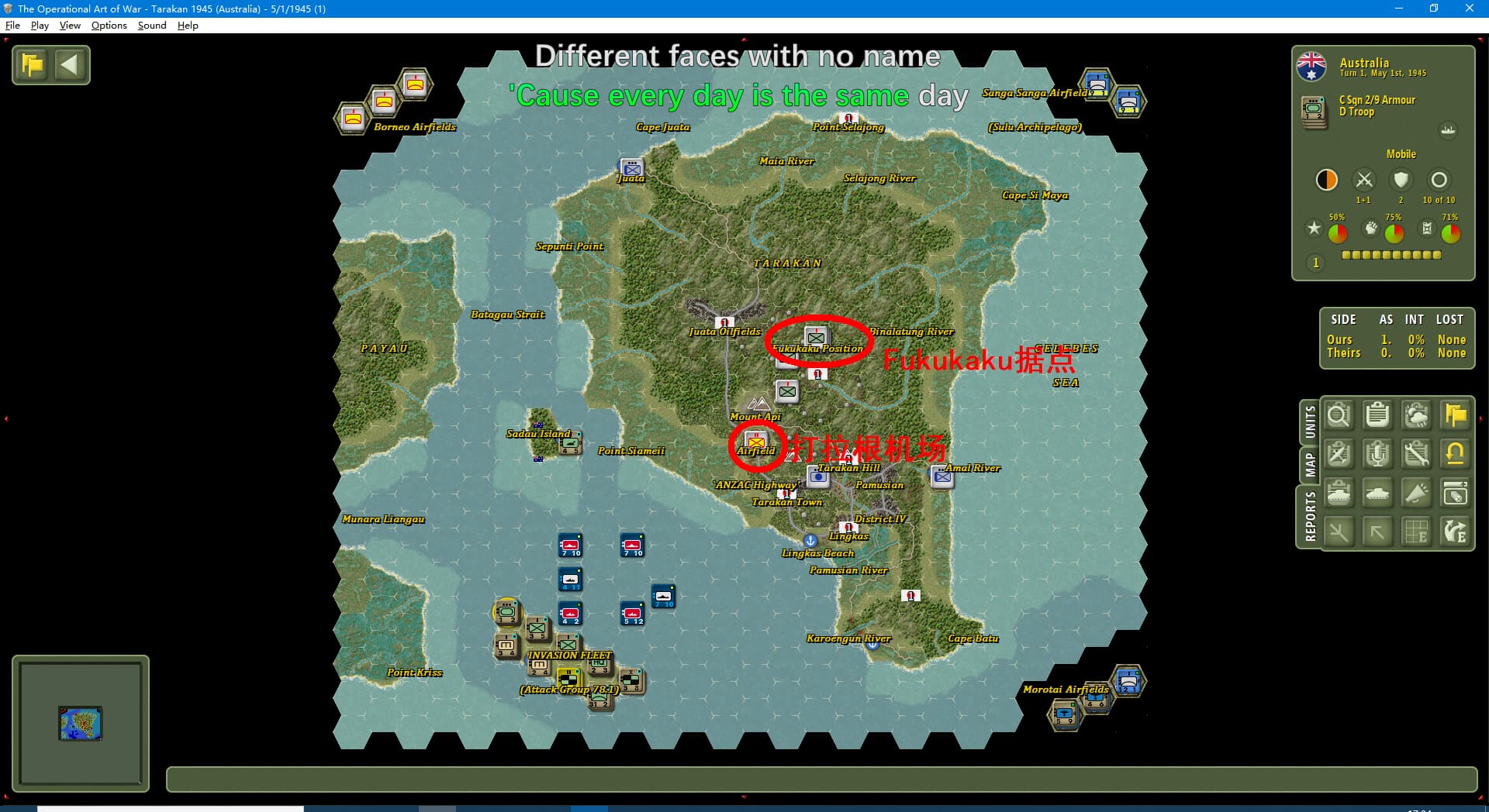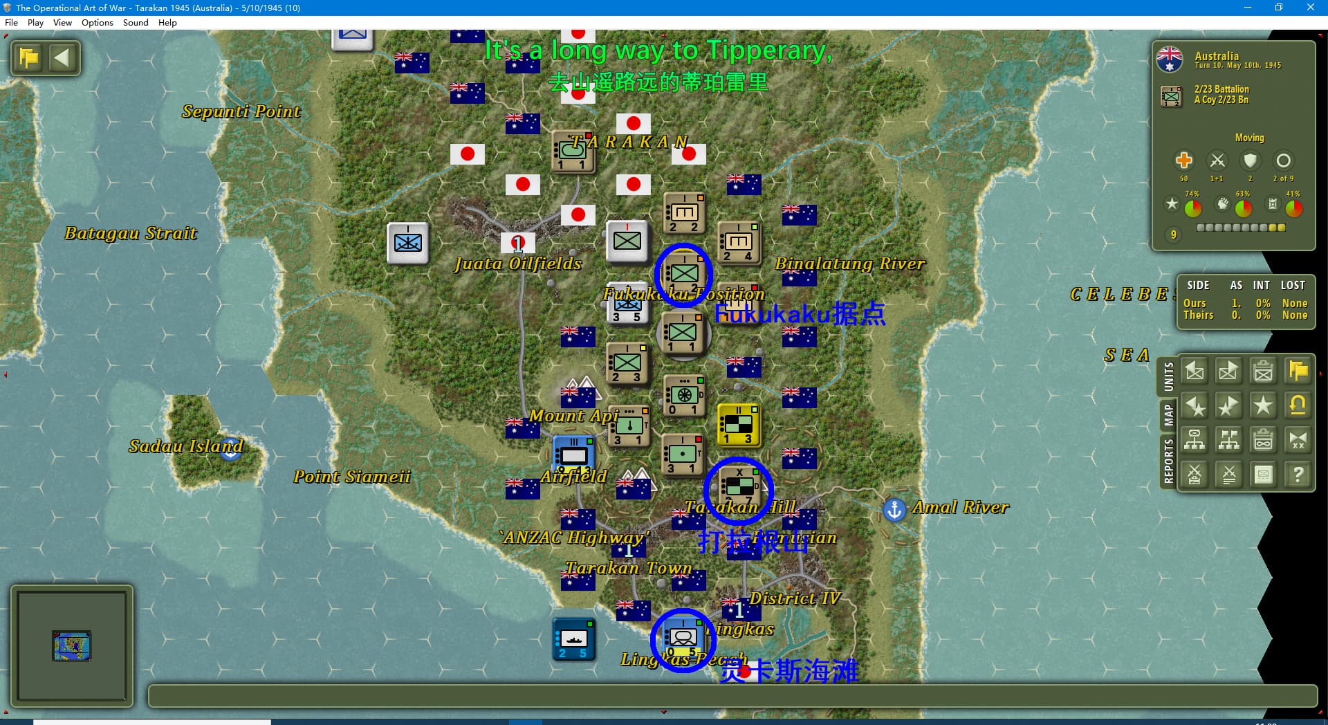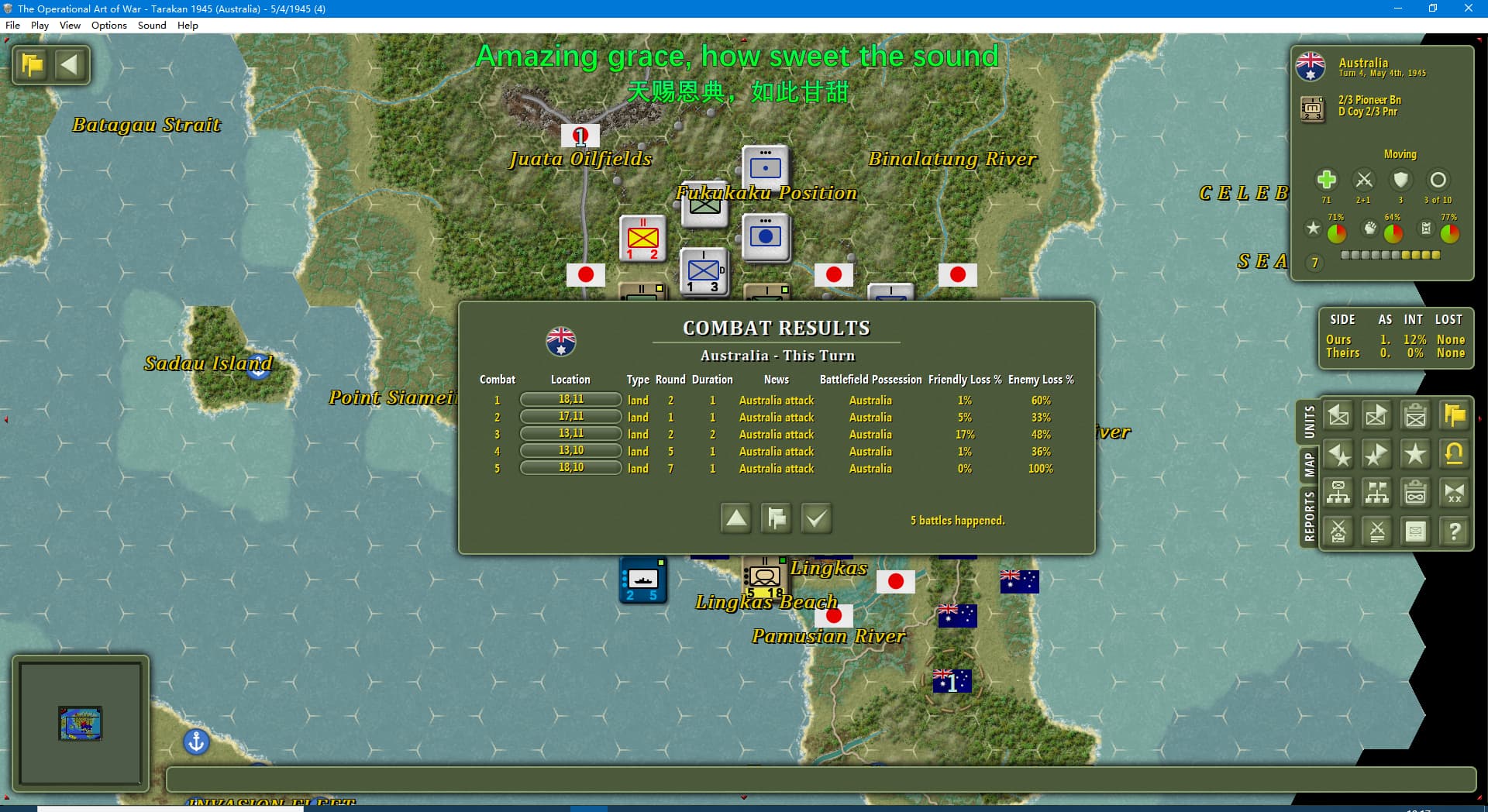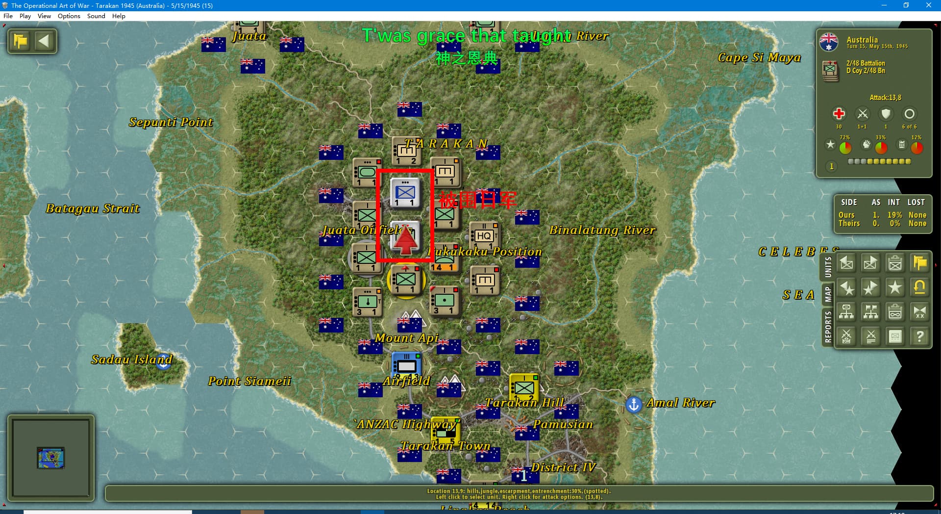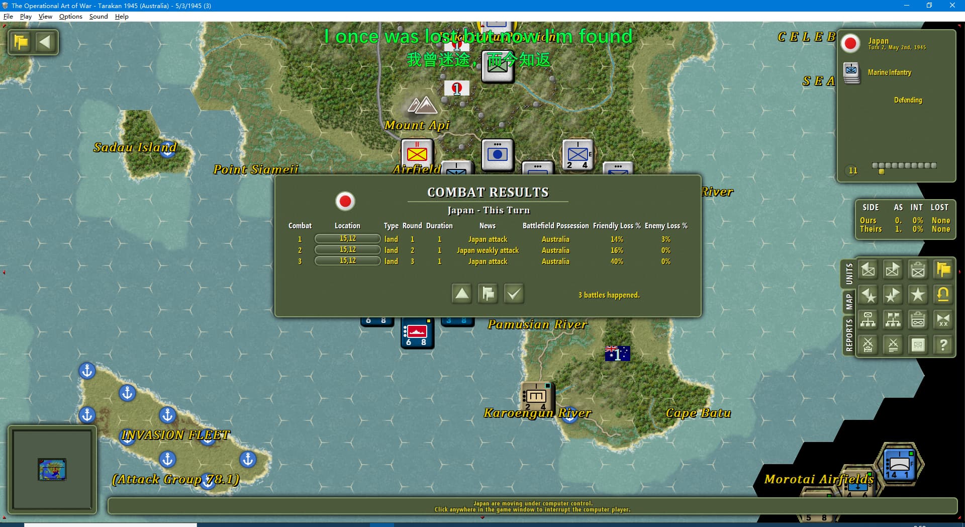 虽然新闻里连续报道我军士气下降(参见两个阶段的新闻事件链),但我军还是全歼了打拉根岛上的日军,占领了所有的胜利点,这次推演于1945年6月11日(第42回合)以我方获胜告终。