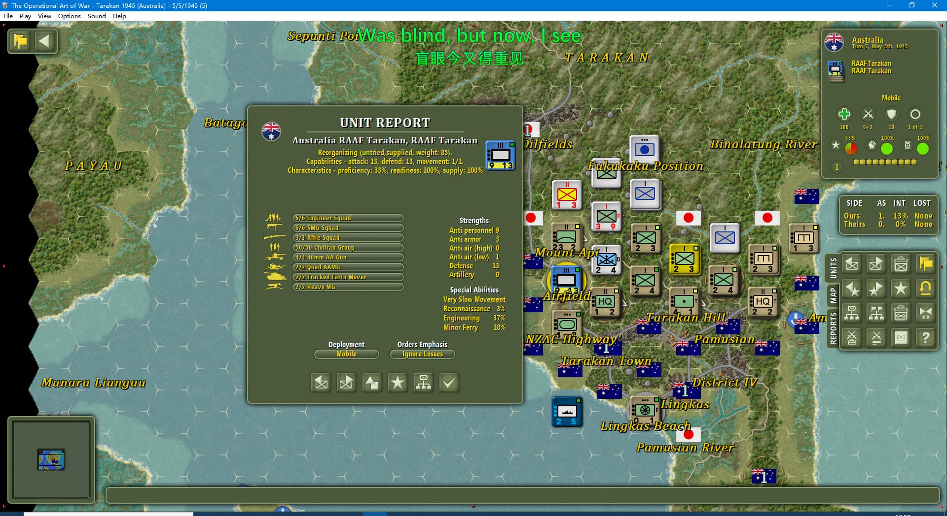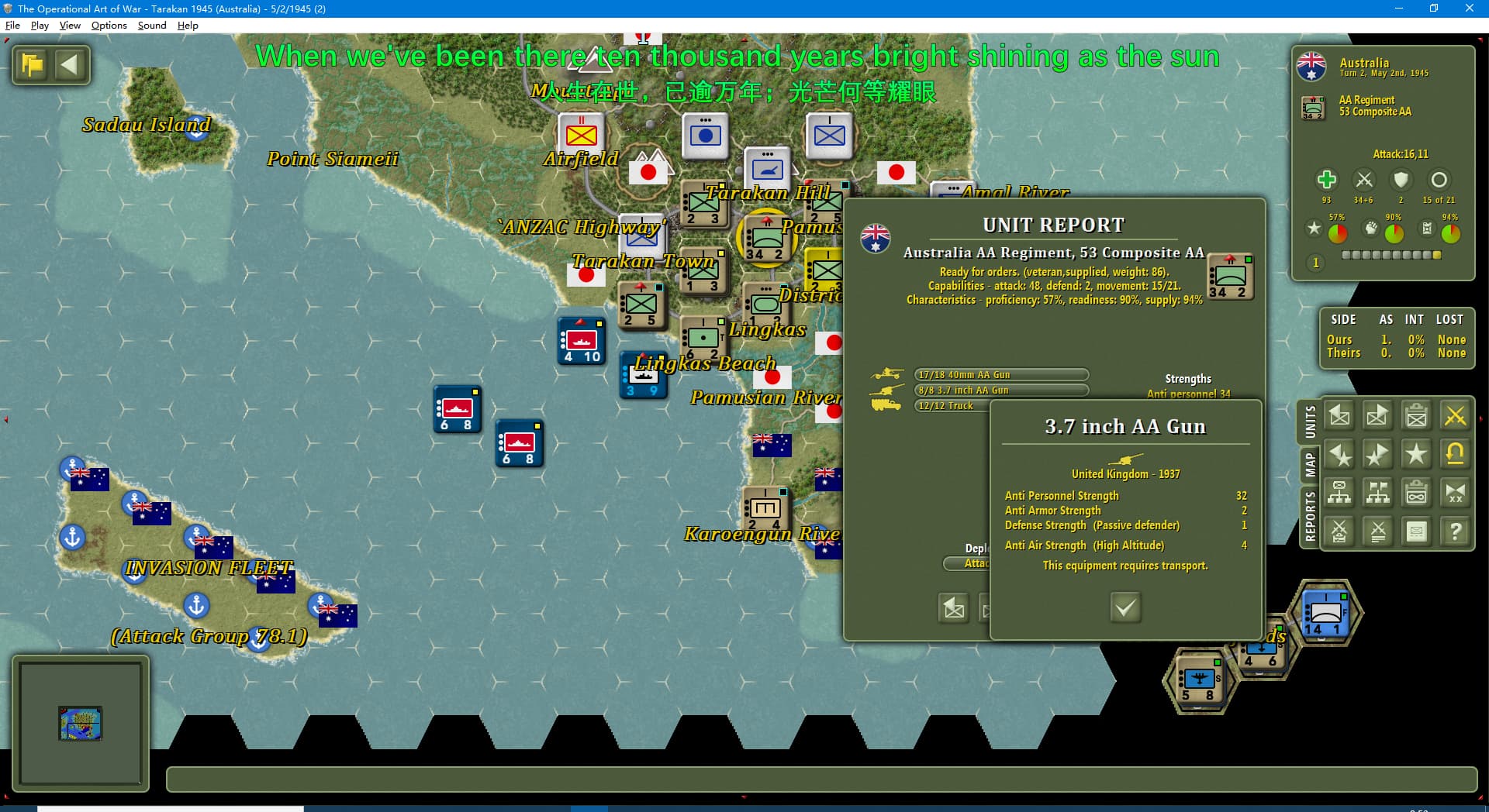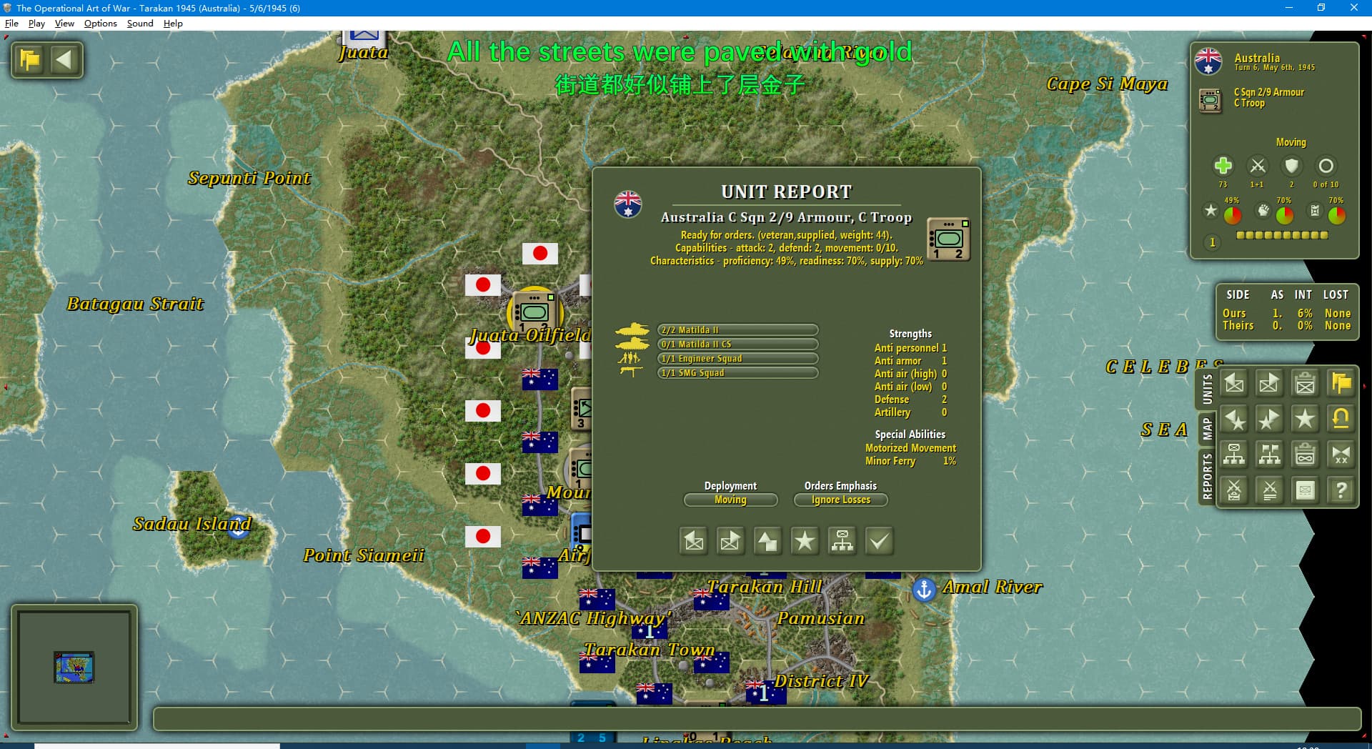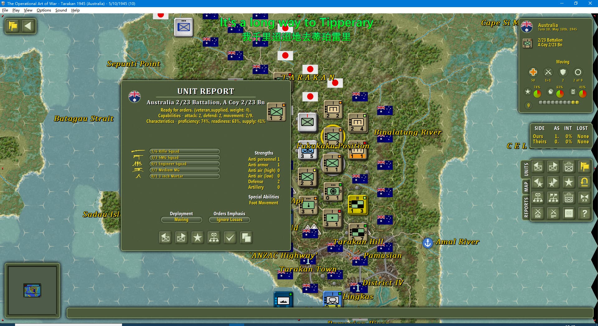虽然新闻里连续报道我军士气下降(参见两个阶段的新闻事件链),但我军还是全歼了打拉根岛上的日军,占领了所有的胜利点,这次推演于1945年6月11日(第42回合)以我方获胜告终。
