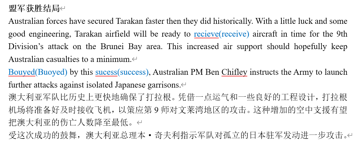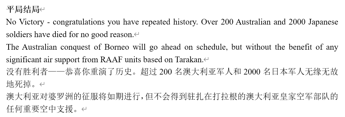《打拉根1945》澳大利亚获胜结局文案的原文和译文。