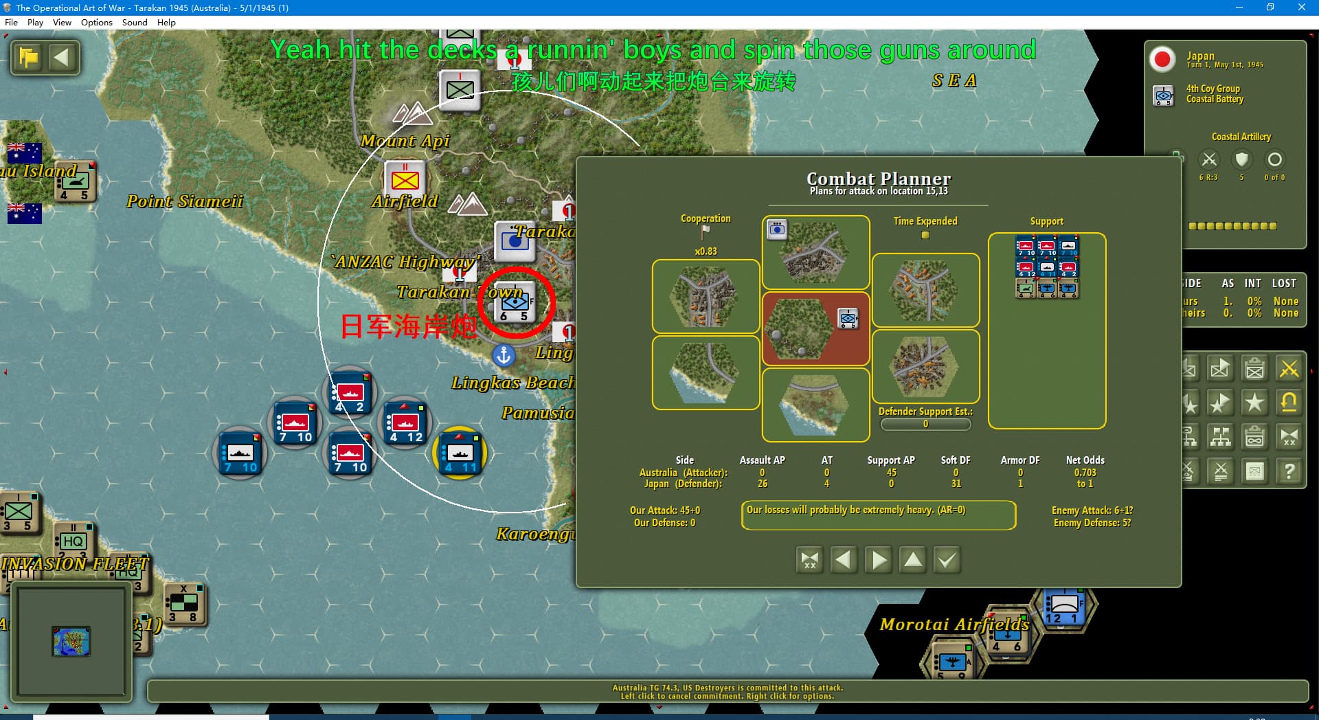我方地面部队全部登陆打拉根岛,高炮平射参与战斗。