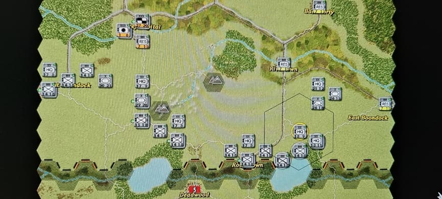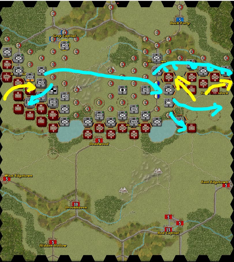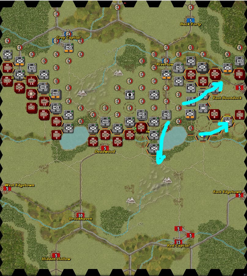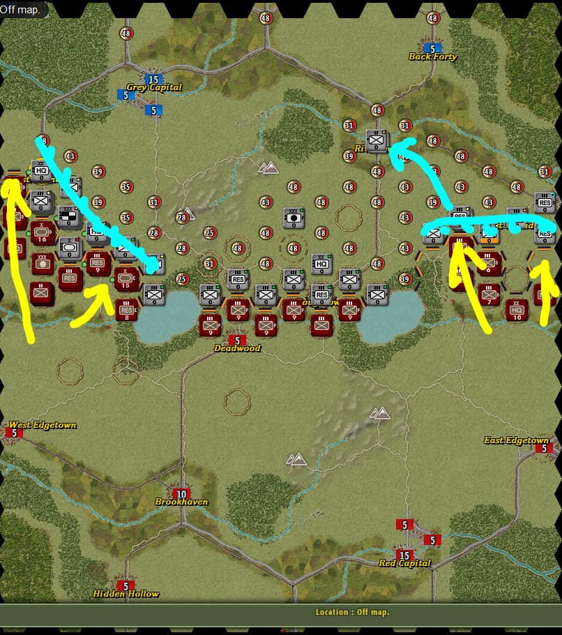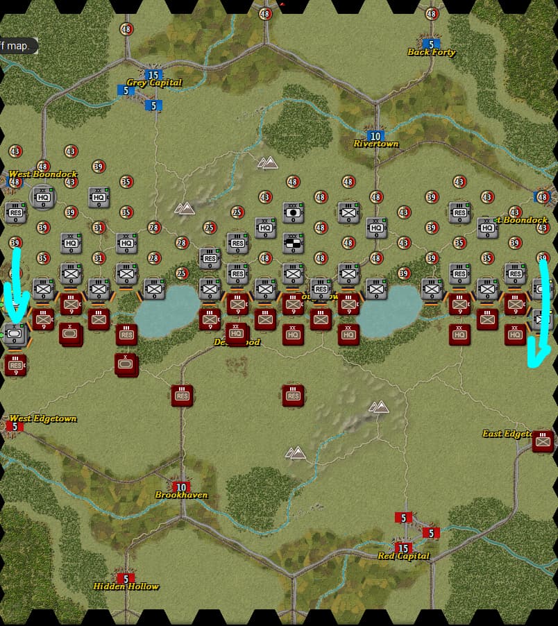 其实我最开始也是认为这样可以虚虚实实让红方把侧翼后方都让出来的,但是同龙城大的请教中得出两个结论,一个是欺负AI和对人的思路是不一样的,人的谋略无论何时都要谨慎对待,这一点我深有体会,以前搞大穿插大迂回打惯了,造成一种凡对战必出奇谋的错觉,二是兵棋游戏要类比现实作战,这个地图就是战线平推死守都能平局,上图这种布阵方式放弃有利地形和F坑,以己虚对敌虚是风险很大的事情——正所谓“昔之善战者,先为不可胜,以待敌之可胜”,又或是“善战者,无智名,无勇功”,对战当是如此