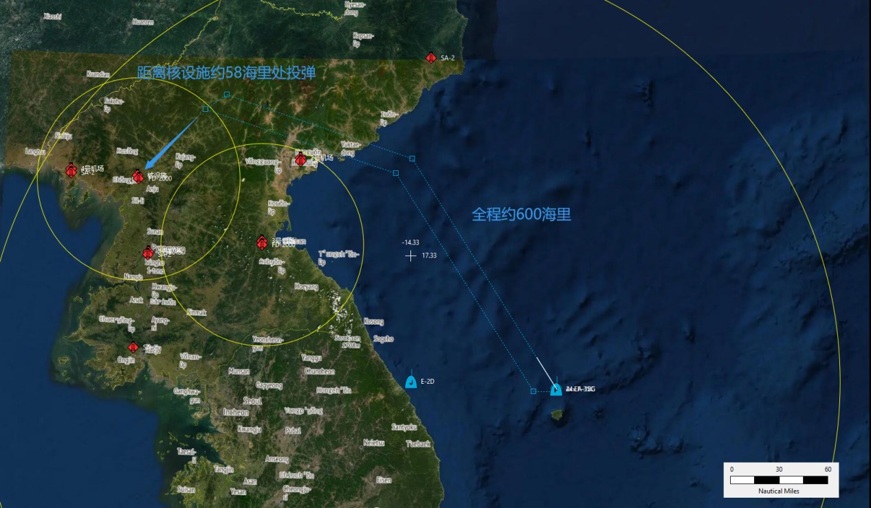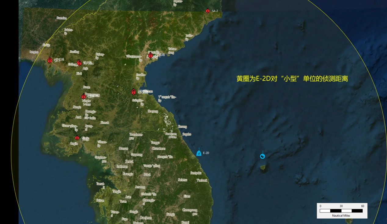 E-2D作为预警机,装备的雷达为APY-81,对信号特征为“小型(small)”的飞机探测距离为263海里,而NK拥有的J-10A和MIG-29的信号特征都是“小型”。那么如图所示,E-2D只需要在SK国上方,或者远离NK海岸线处,就可以实现对NK全境的预警,整个战场处于单向透明态势。