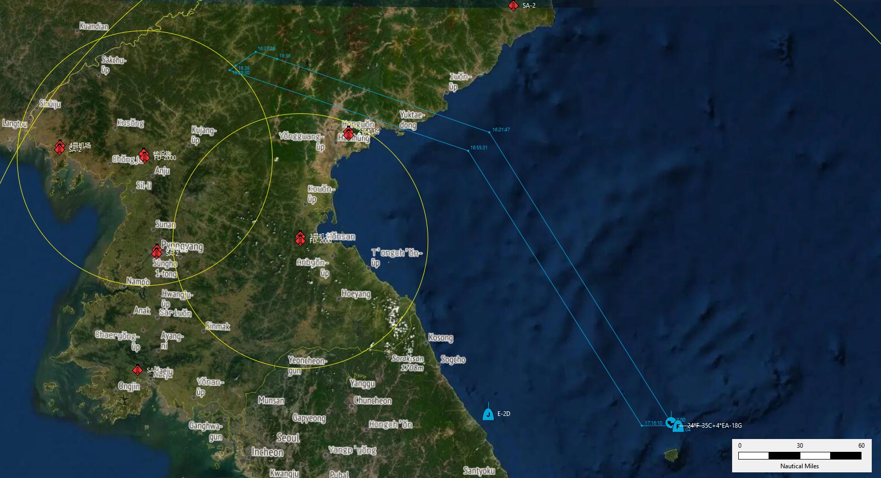 可以看出,在EA-18G强力干扰下,NK的雷达基本成为瞎子。这也是为什么在剧本兵力中,NK的J-10A、MIG-29和SA-2数量都为若干。在E-2D的预警指挥和EA-18G的电子压制下,J-10A、MIG-29和SA-2探测能力趋近于零;FD-2000虽然还有一定探测能力,但在地图上留下了大量空白区域任US飞机随意穿插。而且NK并没有装备数据链,防空雷达即使发现了目标,J-10A和MIG-29仍然要靠自己的雷达发现目标后才能攻击。这无疑是大海捞针,更可能的是被不知道从何处发射的中距弹击落。所以这个剧本中NK的J-10A、MIG-29毫无作用,即使提前起飞巡逻,US攻击群也可以在E-2D的指挥下,避开巡逻路线,直取目标。
