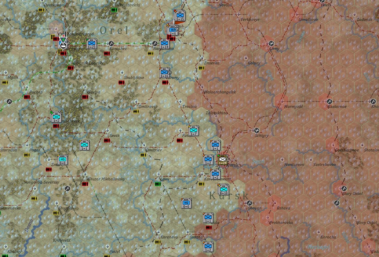 这意味着本回合无力展开任何进攻。在南面,一支步兵军往库尔斯克方向移动,意图包围该城。