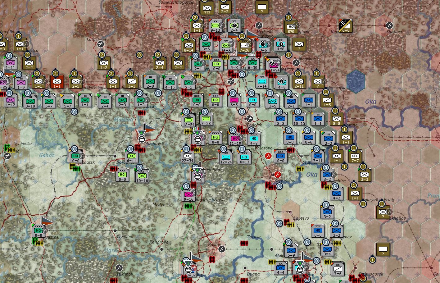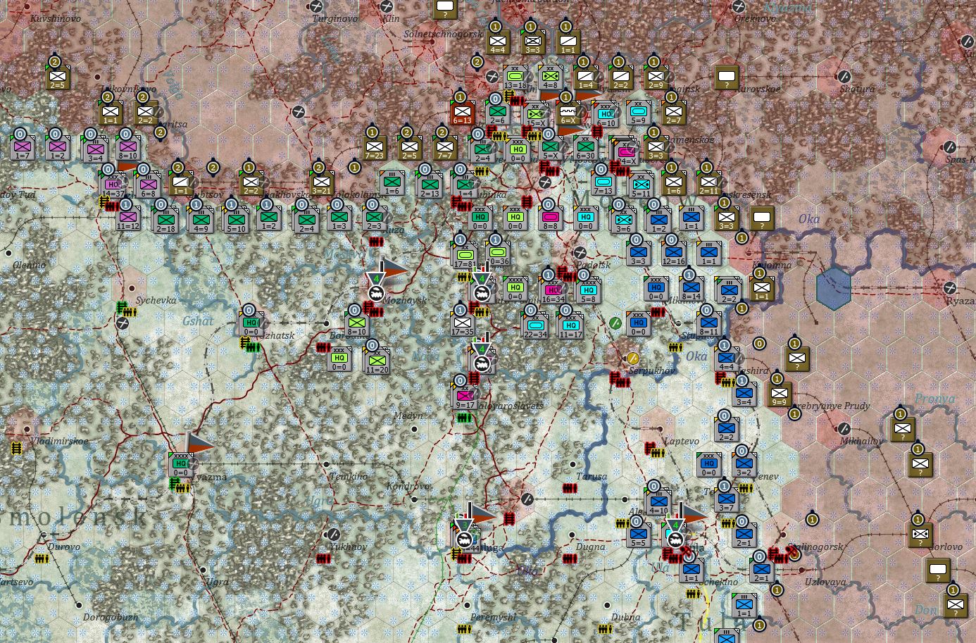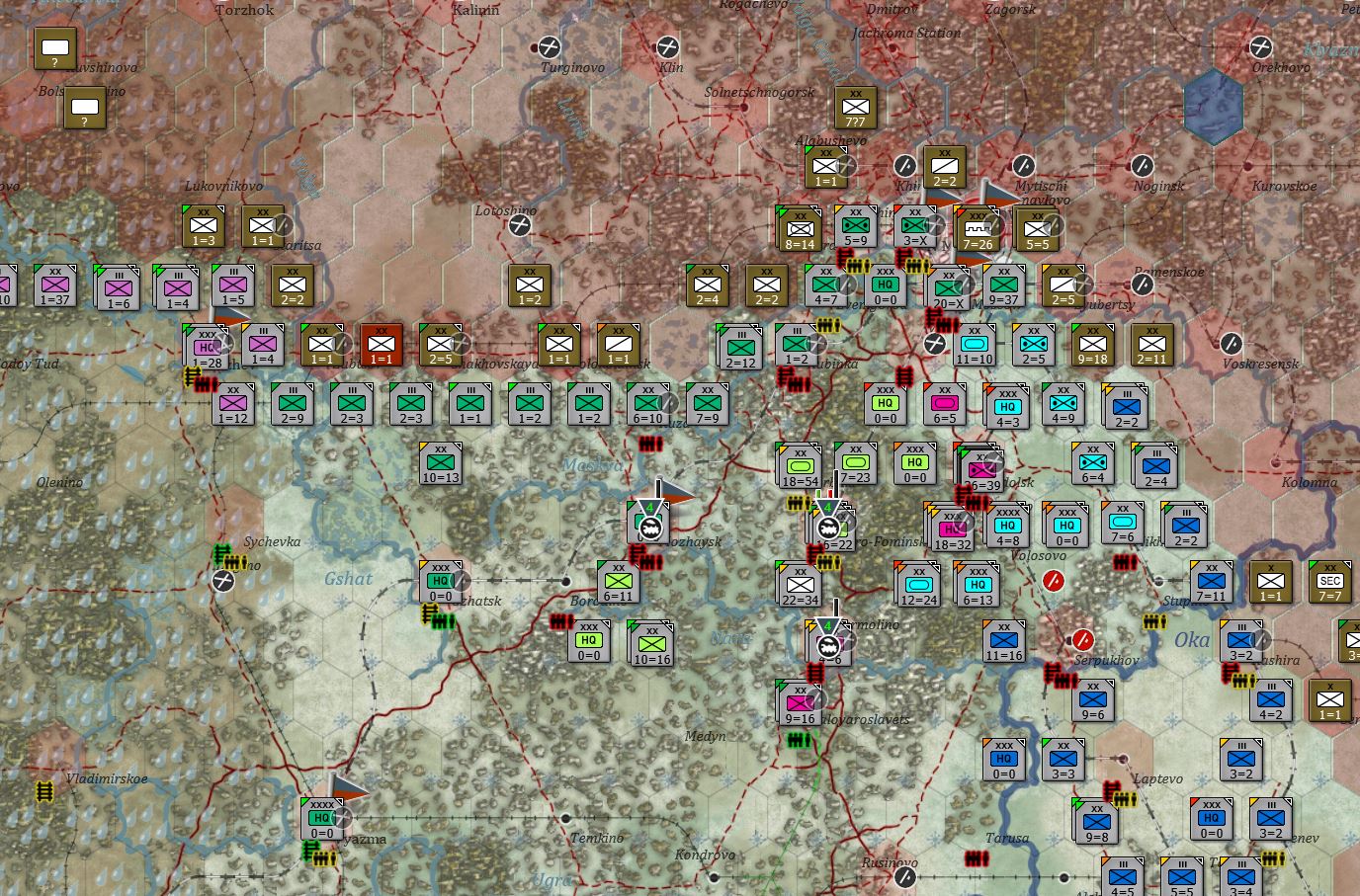 苏军基本上能撤都撤了,从勒热夫(Rzhev)到莫扎伊斯克拉了条新防线,现在是要守莫扎伊斯克了,也是对的,毕竟莫扎伊斯克是胜利点。东南边的情况我就没放出来了,敌军都跑的没影了。