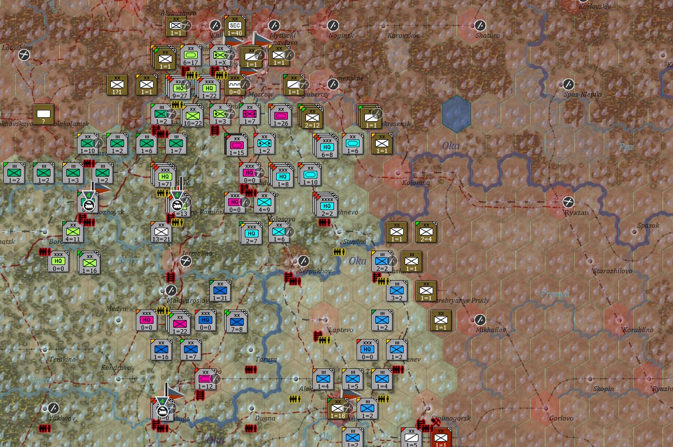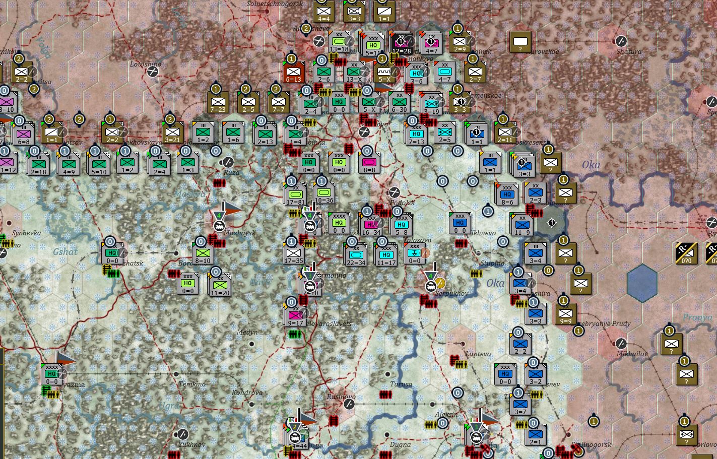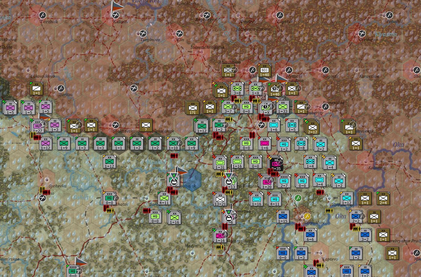 苏军基本上能撤都撤了,从勒热夫(Rzhev)到莫扎伊斯克拉了条新防线,现在是要守莫扎伊斯克了,也是对的,毕竟莫扎伊斯克是胜利点。东南边的情况我就没放出来了,敌军都跑的没影了。