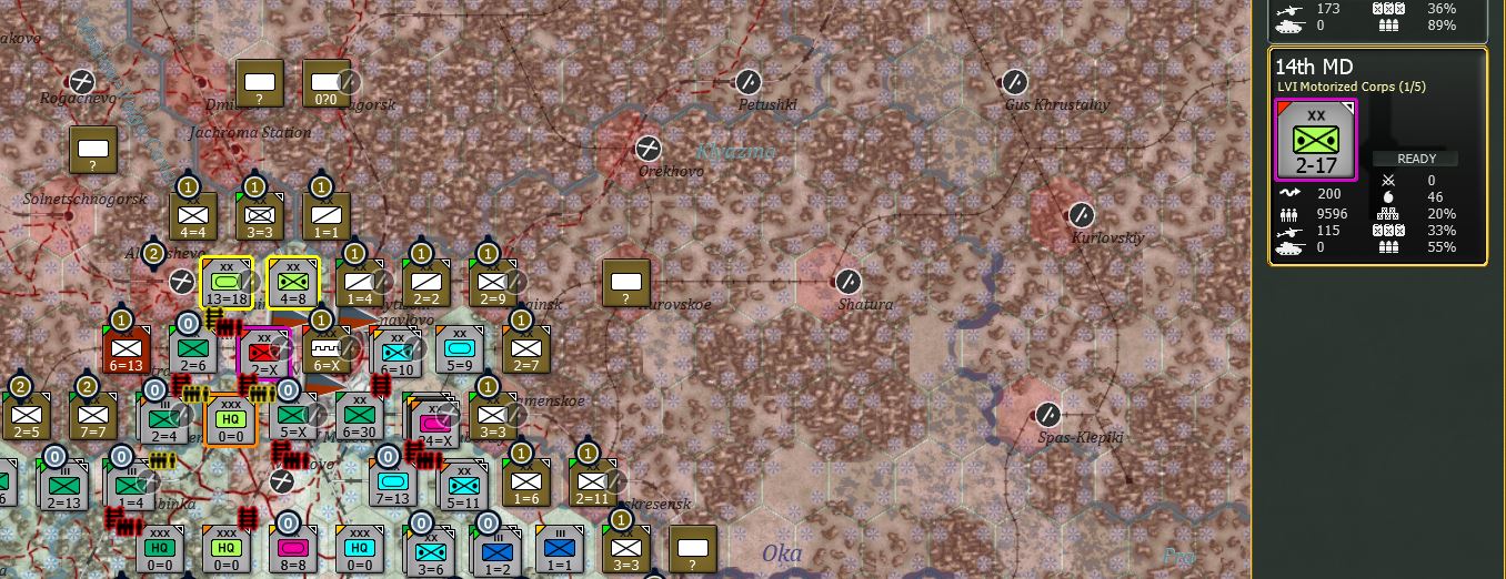 第2装甲集群在T1应当占领奥廖尔(Orel),这座城在剧本初设时是完全放空的;第3装甲集群在T1应当抵近维亚济马;第4装甲集群从中央突击分两路策应实现合围。
