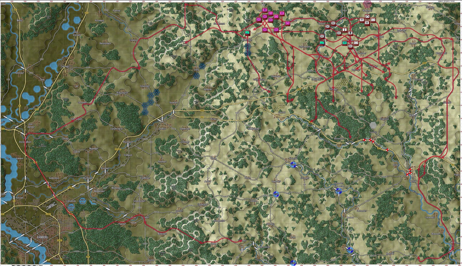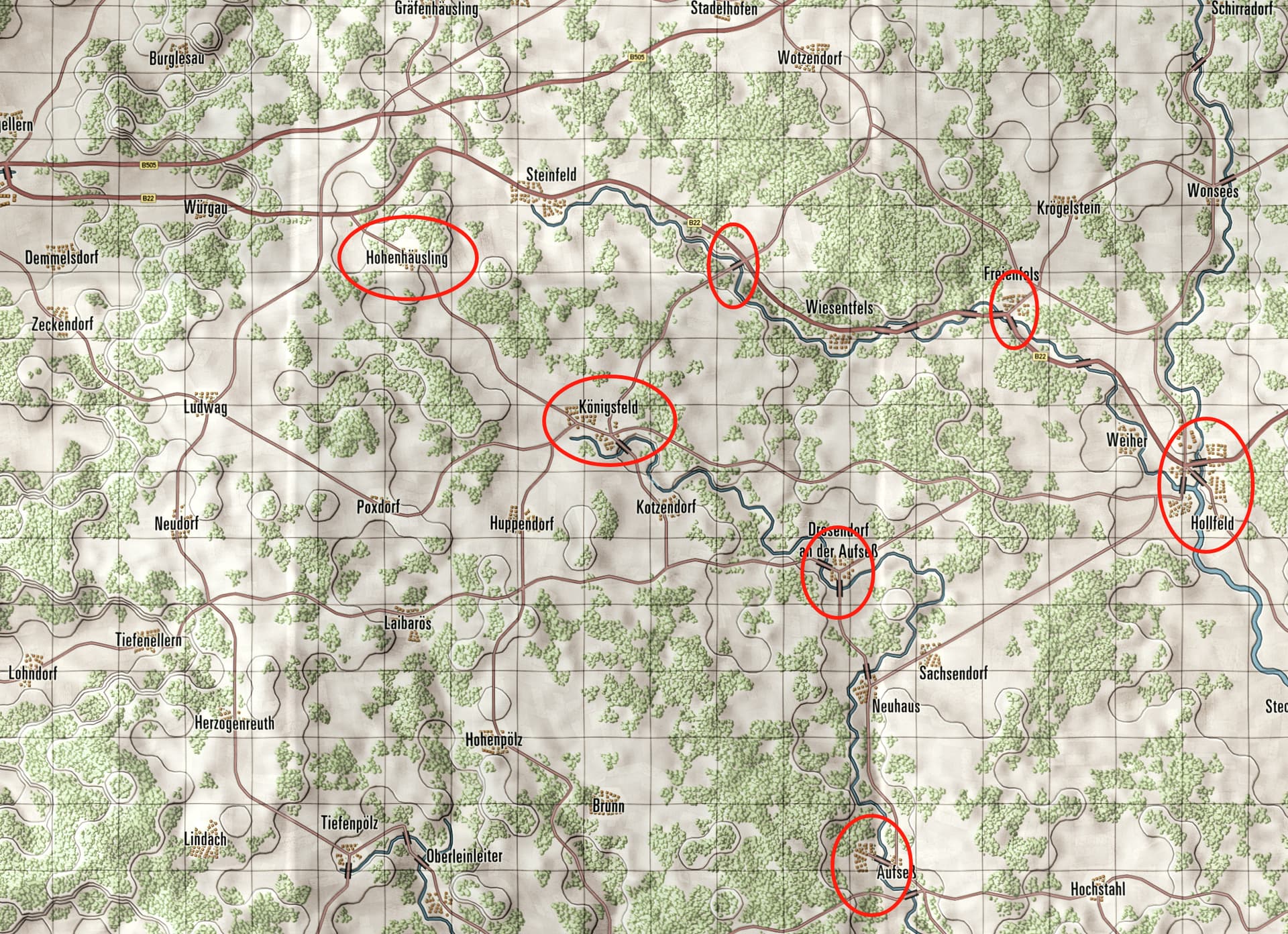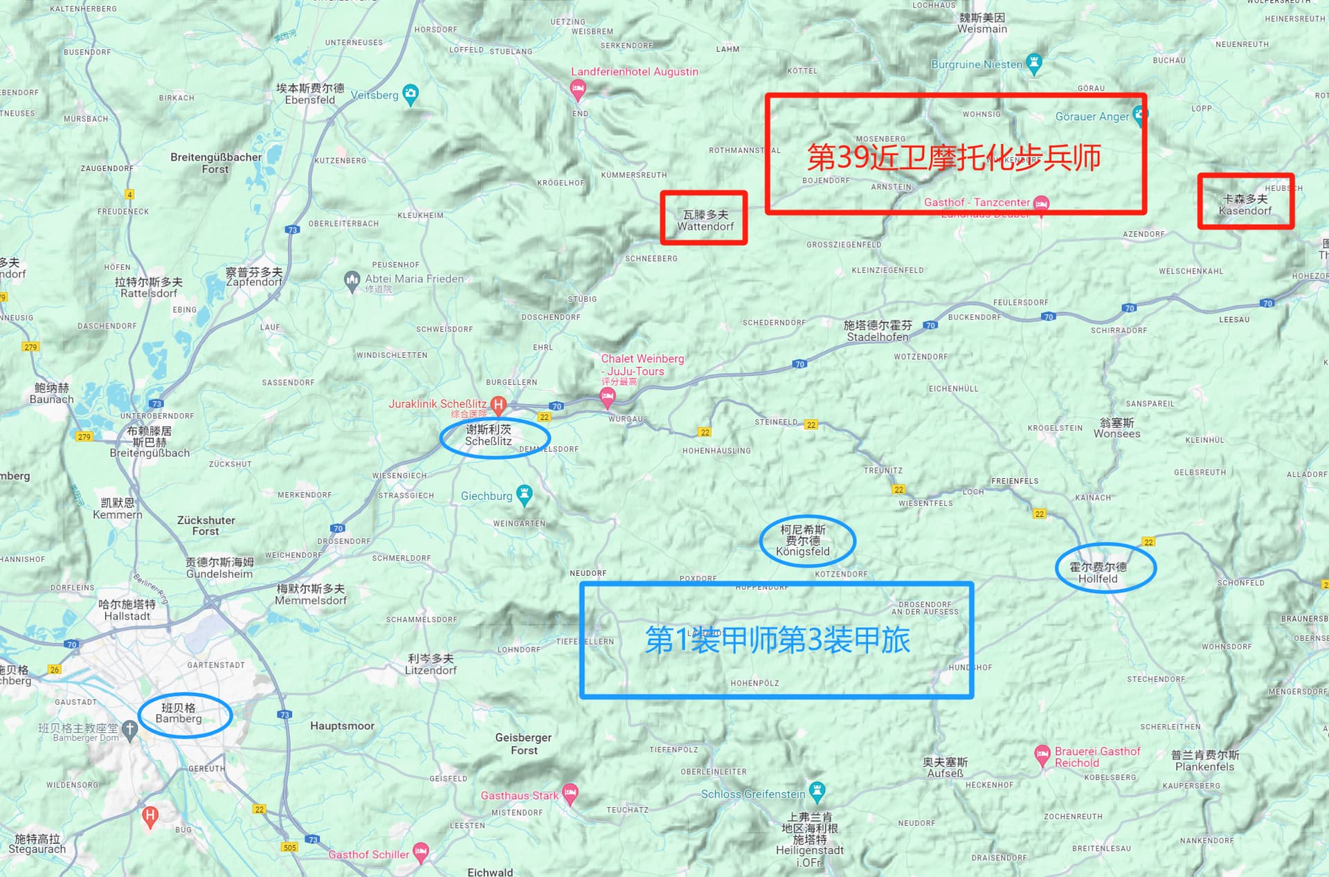 美军第3装甲旅盘踞于谢斯利茨(ScheBlitz)、柯尼希斯费尔德(Königsfeld)以及霍尔费尔德(Hollfeld)一线;