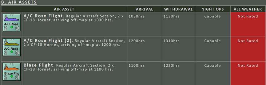 - 近距离空中支援:CF - 18 战机(“玫瑰” 编队和 “烈焰” 编队)将于 10 时 30 分至 13 时左右提供支援。