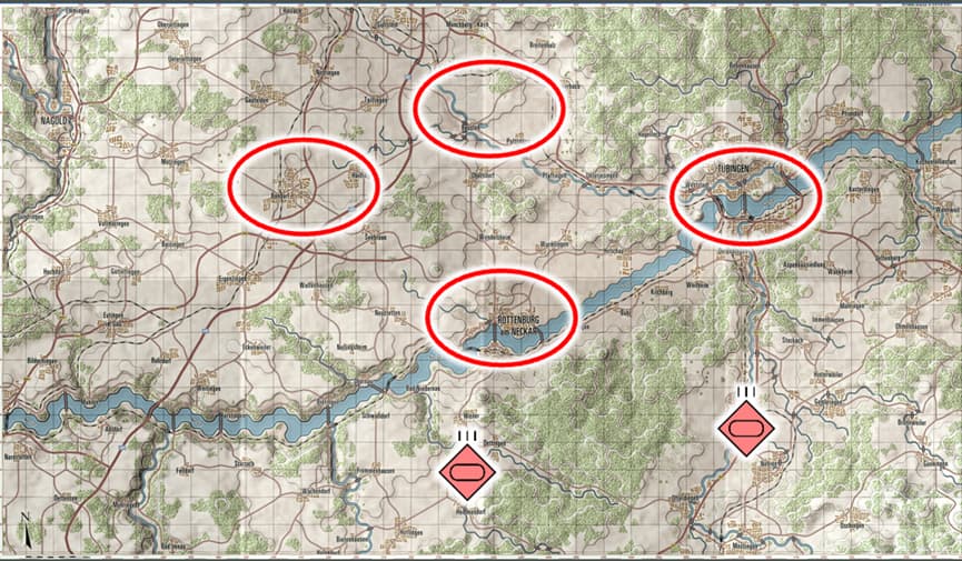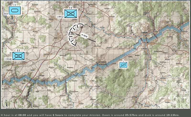 第 11 近卫坦克师(GTD)正快速向西北方向推进。预计其第一梯队的侦察部队将于 8 时左右抵达罗滕堡附近的内卡河。第一梯队可能由第 7 和第 40 两个坦克团组成。