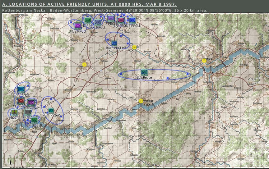 加拿大第 4 机械化旅群(CMBG)正沿 A81 高速公路进入斯图加特西南方向的阻击阵地。他们分散部署,两个步兵营在前,均有装甲部队支援。该旅的任务是阻止(阻击)苏联部队推进。计划是让加拿大部队牵制住苏联部队,以便法国部队实施反击。