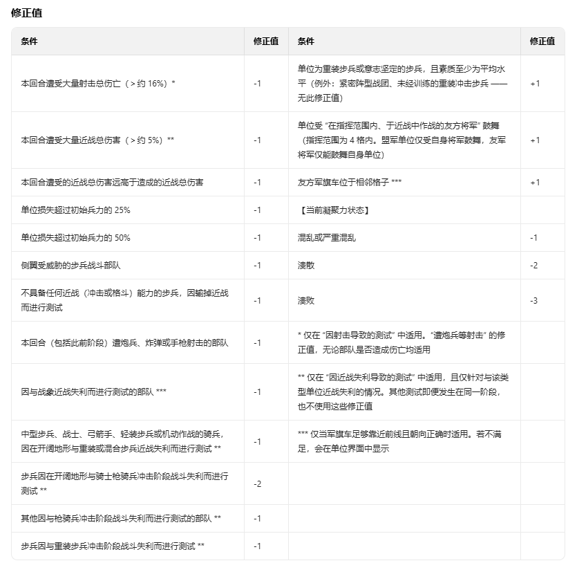 测试需在“应用修正值后”得到6分及以上方可通过。若测试失败,单位凝聚力会降低1级;若得分低于3分,部分情况下凝聚力会降低2级(注:因射击导致的凝聚力降低不会出现“连降两级”;因近战导致连降两级,仅当单位在近战中惨败时才可能发生)。