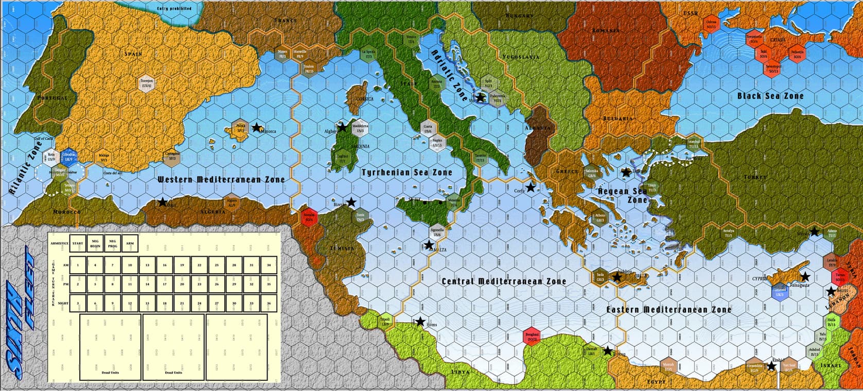 - 第六舰队:每个重要的地中海国家在游戏开始时以及游戏中的某些节点,其中立或交战状态是随机确定的。大多数国家通常只倾向于一方,或者保持中立,但有少数国家可能倒向任意一方。只有美国、苏联、英国、法国和意大利的水面单位可以移动到距离其最近港口超过十个六角格的区域。潜艇没有移动限制。不同国家的单位不能组成特遣部队,不能一起激活,也不能在其他国家的基地补给(例外:出于这些目的,美国和英国的单位被视为同一国家的单位)。空中单位不能使用其他国家的空军基地(这也影响美国/英国的单位),不过在某些效忠掷骰结果下,盟国可能允许美国或苏联的空中单位使用其基地。