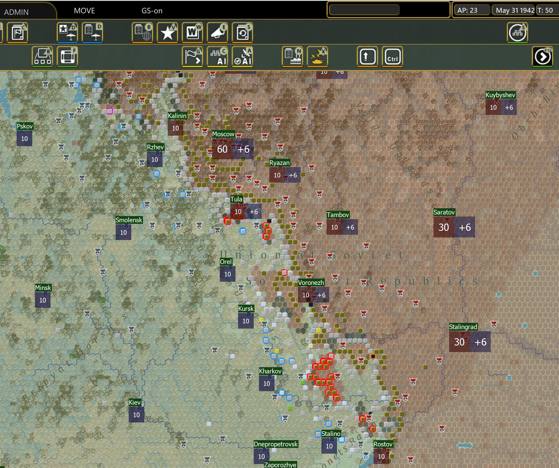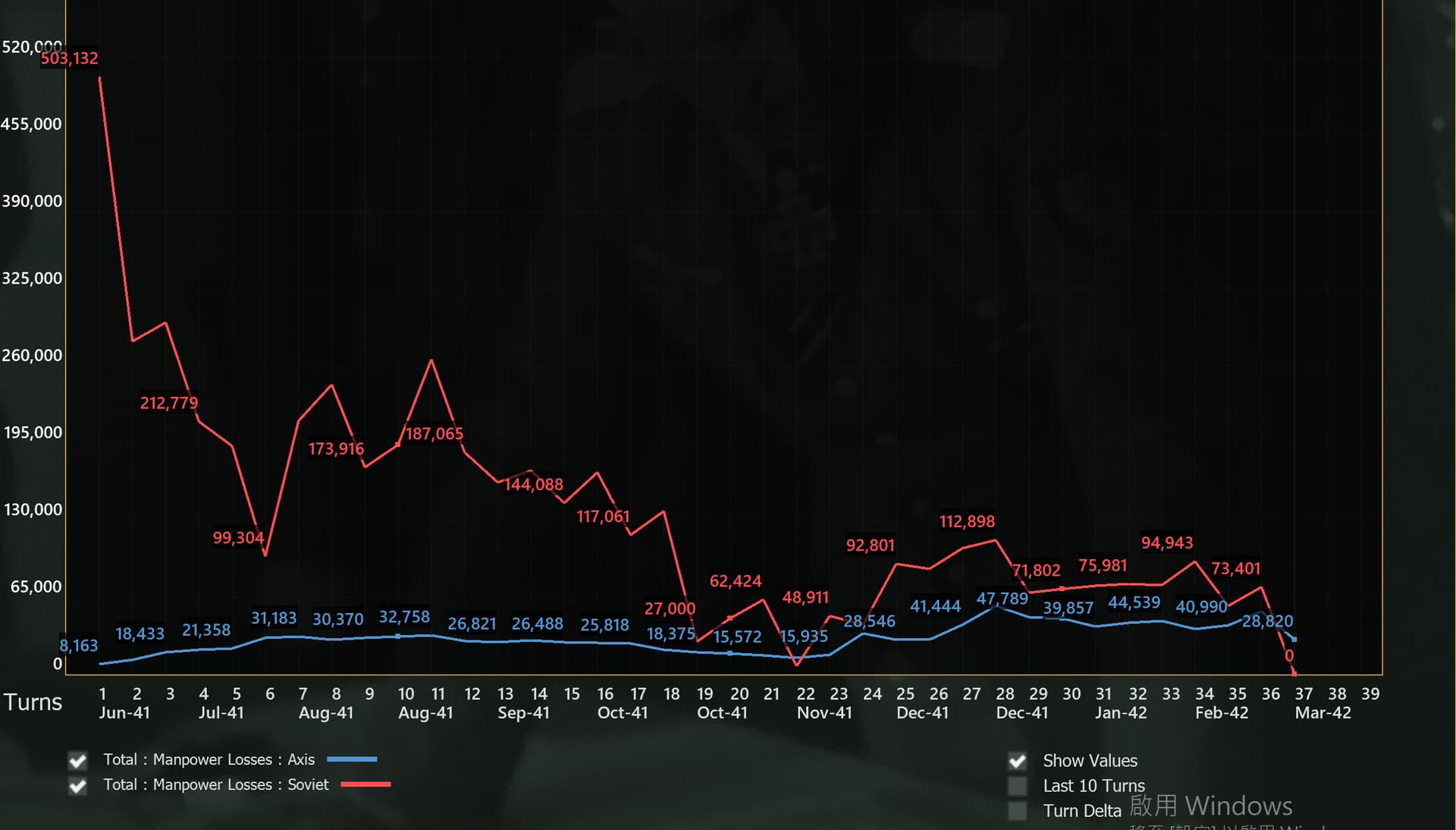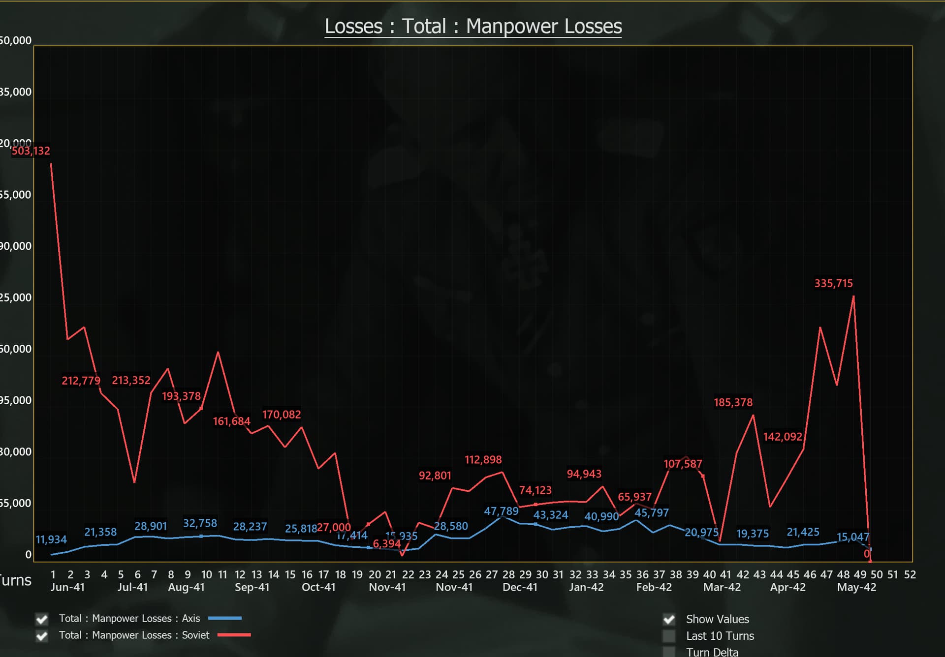 战线现在维持在诺夫哥罗德-勒热夫-维亚济马-库尔斯克-哈尔科夫-斯大林诺,Axis有100万的伤亡(主要是Disabled),Soviets 达到了500万的伤亡。