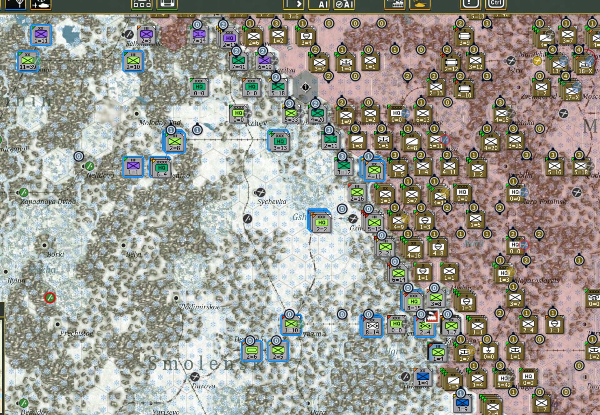 我发起攻势之后AI变得呆呆的。它很少反击。即便部队被我团级单位包围也很少尝试解围,而总是把部队拉后撤以组织新的防线。