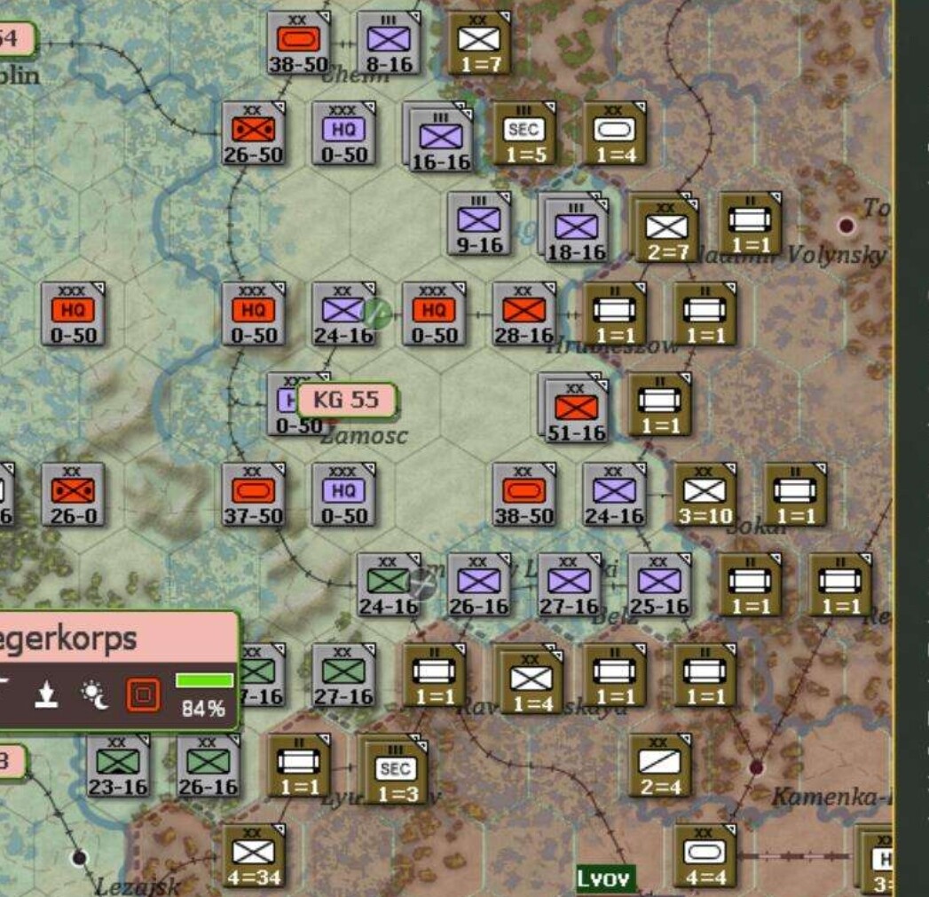 所谓对包围圈内部队的“卡位”,体现在增加敌方离开ZOC的移动力和被包围单位因补给缺乏,获得的MP减少上。